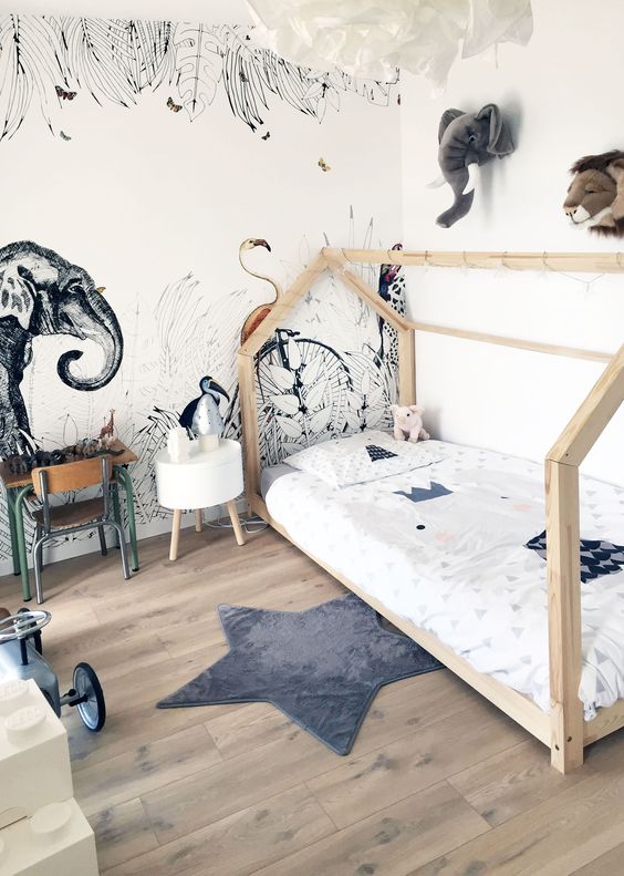Es por ello que en las habitaciones infantiles Jungla modernas no puede faltar una cama de estructura “casita”